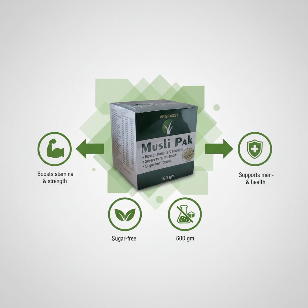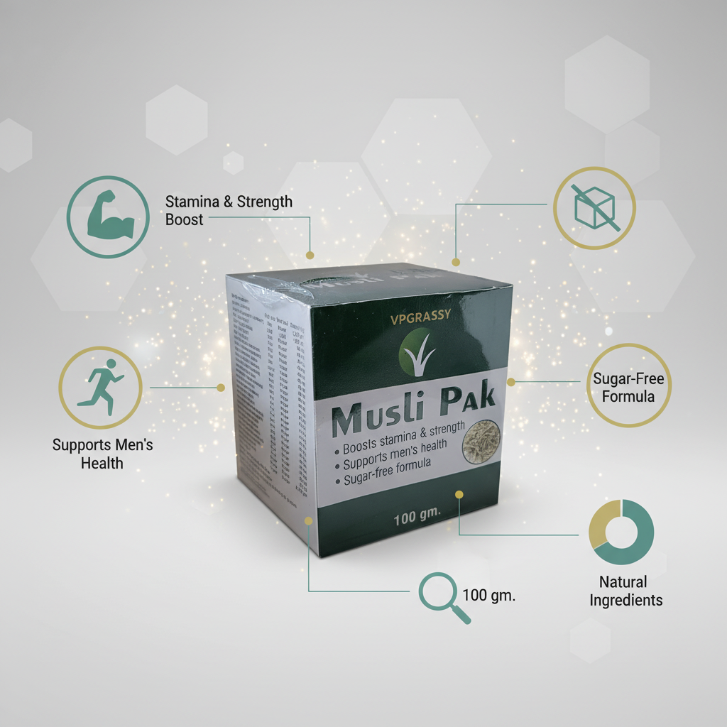 VPGRASSY Natural Musli Pak is a traditional Ayurvedic formulation specially crafted to enhance male vitality, stamina, and strength. This 100gm jar contains a potent herbal blend of Safed Musli, Ashwagandha, Shatavari, and other essential herbs, known to support hormonal balance, energy levels, and immunity. Regular use of this herbal supplement may help reduce fatigue, improve endurance, and support reproductive wellness. Free from added sugars, artificial preservatives, and harmful additives, VPGRASSY Musli Pak is a trusted natural remedy for those seeking enhanced vitality the Ayurvedic way.